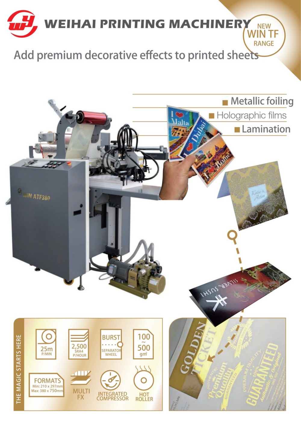Пресс для ламинирования и тиснения фольгой с листовой подачей шириной 380 мм способен автоматически выполнять горячее тиснение металлических и цветных узоров без использования традиционных пластин для горячего тиснения. Он подходит не только для небольших тиражей цифровых приложений, но и для традиционной офсетной печати. Он использует голографические пленки для автоматического создания узоров из точек и водной ряби, что делает печатные материалы еще более изысканными.