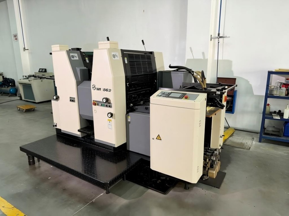Это офсетная печатная машина для двухцветной печати этикеток формата А2. Он создан для малых и средних тиражей. Все дело в эффективности и простоте использования. Он может печатать два цвета за один проход бумаги. Это экономит время и работу. Он оснащен устройством быстрого позиционирования и натяжения для установки пластин. Это сокращает время переналадки. Также имеется полуавтоматическая система очистки красочного валика, которая ускоряет смену цвета и облегчает работу оператора. Пресс оснащен системой непрерывной подачи бумаги. Он оснащен вакуумным присосочным столом и тремя вращающимися транспортировочными ремнями. Эта установка хорошо справляется с бумагой разной толщины. Захваты с двойной пружиной предотвращают соскальзывание бумаги. Это ключевой момент для высокоскоростной печати. У него есть и практические функции. Такие вещи, как увлажнение спиртом и автоматическая регулировка объема воды. Он также имеет качественную подачу бумаги с воздушными соплами и всасывающими колесами.
